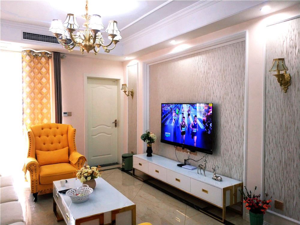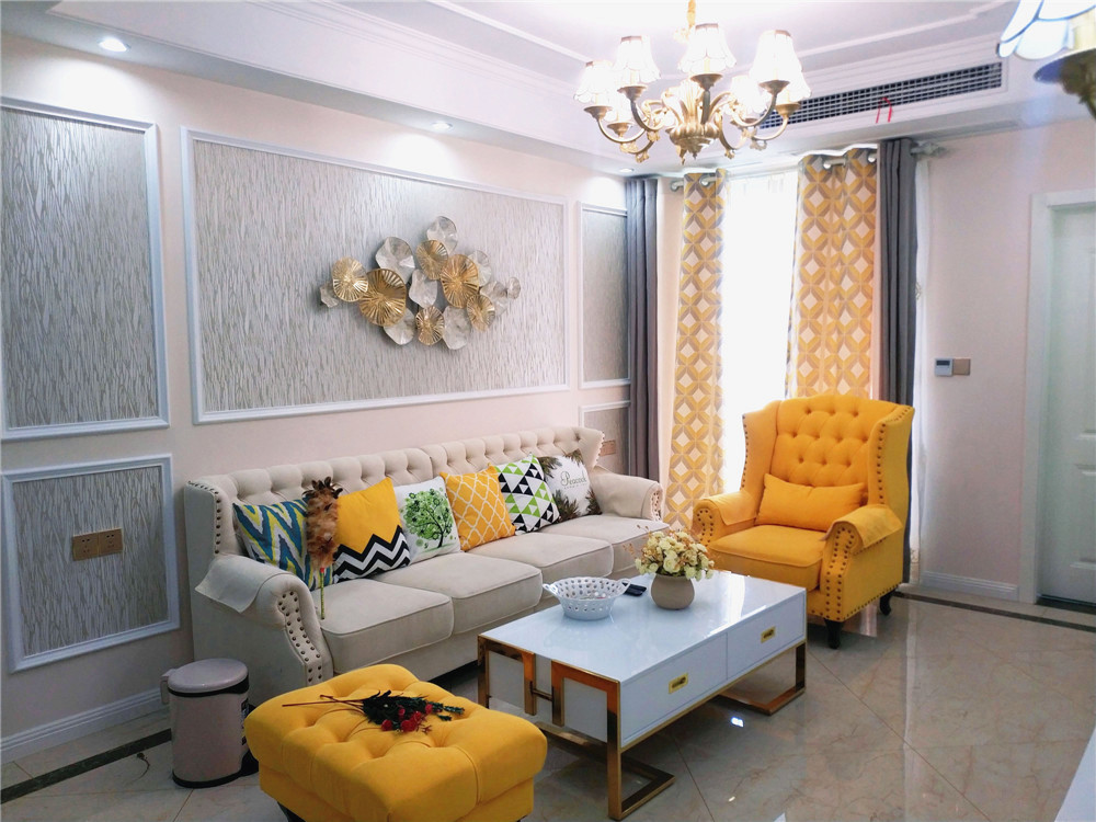 柔軟的布藝沙發(fā),是營(yíng)造溫馨氛圍的不二之選。沙發(fā)的顏色選取了簡(jiǎn)單的白色和明快的姜黃色,不經(jīng)意間流露出活潑的氣氛。金屬的墻面飾品與金屬銅色的燈具相得益彰,彎曲的弧度與圓環(huán)的形狀讓它們不會(huì)顯得過(guò)分生硬,而是在現(xiàn)代的氣氛中恰到好處地融入了一絲古典氣息。隨處可見(jiàn)的仿生花點(diǎn)綴了各個(gè)角落,為屋里增添了不少活力,更添溫暖與柔情。