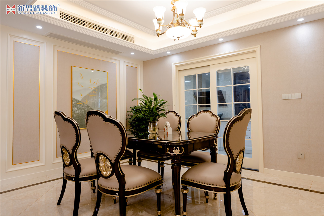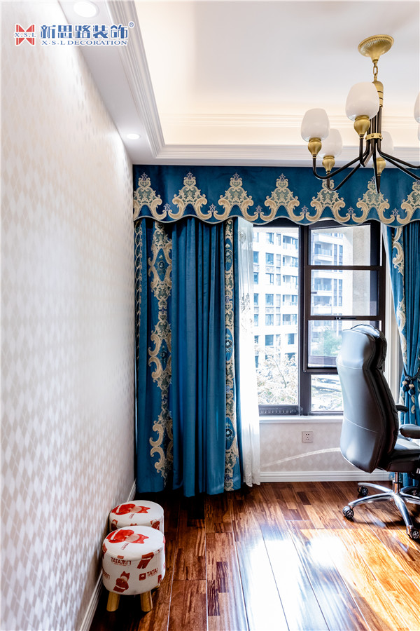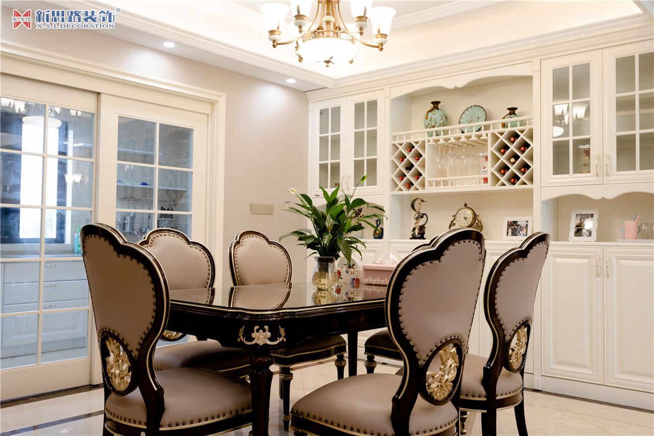 沙發(fā)背景墻使用石膏線材勾畫(huà)幾何圖形,古典優(yōu)雅;陶瓷的小鹿漫步花間,野趣橫生。復(fù)古花色的窗簾與真皮質(zhì)地的沙發(fā)以及實(shí)木電視柜搭配起來(lái)正合適,線條分割成菱形網(wǎng)格狀的乳白色電視背景墻大方低調(diào),黃銅色美式吊燈干凈明亮。深墨綠色的織錦桌旗無(wú)形中又添了點(diǎn)奢華意味,油青色的仿古裝飾擺件也是非常經(jīng)典的美式元素體現(xiàn)。