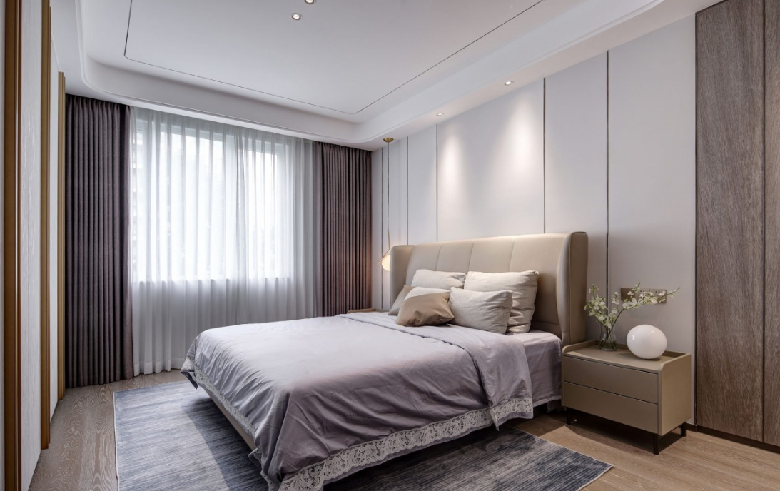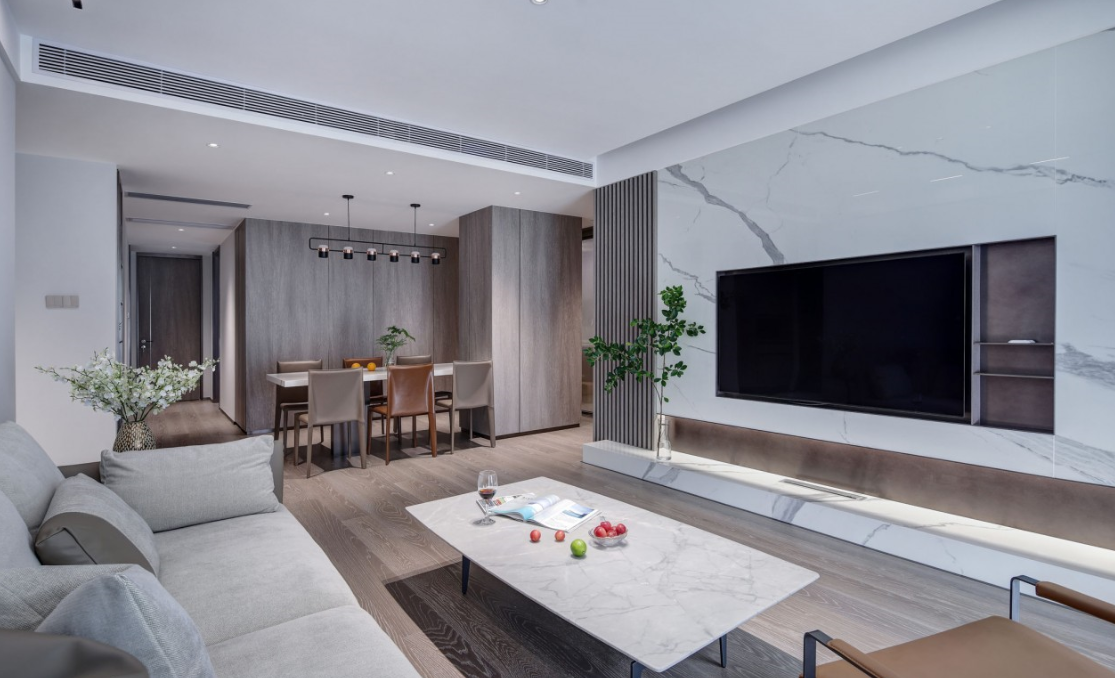 采用明亮而不眩目的無(wú)主燈設(shè)計(jì),筒燈與磁吸燈簡(jiǎn)約靈活的泛光照明,電視背景墻下隱藏?zé)魩У男Ч麪I(yíng)造,優(yōu)化了空間形體以及局部的明暗關(guān)系