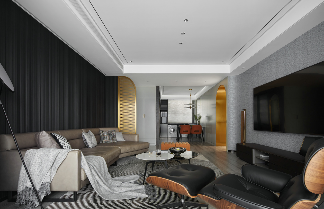 餐廳與客廳之間毫無阻隔,可以想象與好友們相聚用餐時的開放與隨性,不拘泥于空間的功能性。金色的包邊線條與白色皮革組合,產(chǎn)生一種當(dāng)下潮流的時尚之美,同時透過色彩搭配,來增強(qiáng)空間的整體性。