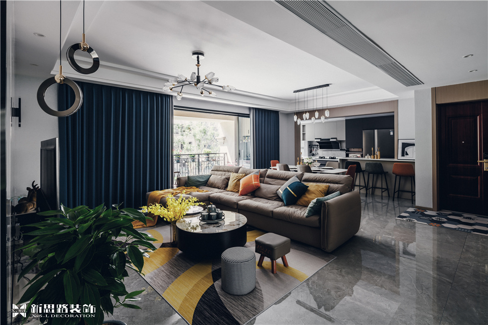 客廳的色彩搭配上選擇撞色設(shè)計(jì),淺色系的白、淺棕、灰,深色系的黑、深棕、藏青,還有冷色系和姜黃、深橘色等暖色系的相碰,為空間增添了不少活力和生機(jī)。大理石紋理的電視墻與茶幾、電視柜在低調(diào)中又透出一絲奢華之感,沙發(fā)選用科技布材質(zhì),更加柔軟舒適,忙碌一天回到家后于此小坐,能得到更好的休息與放松