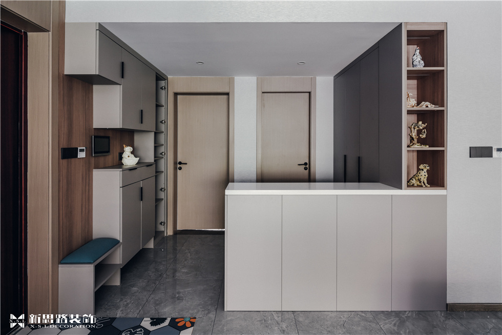 玄關(guān)放置換鞋凳,家中老人進(jìn)出換鞋更方便。一旁的小吧臺(tái)能很好地起到隔斷作用,將父母房和衛(wèi)生間隔開(kāi),使精簡(jiǎn)功能分區(qū)更明確。吧臺(tái)上可放置物品,下方的柜體也能增加儲(chǔ)物空間,十分實(shí)用。