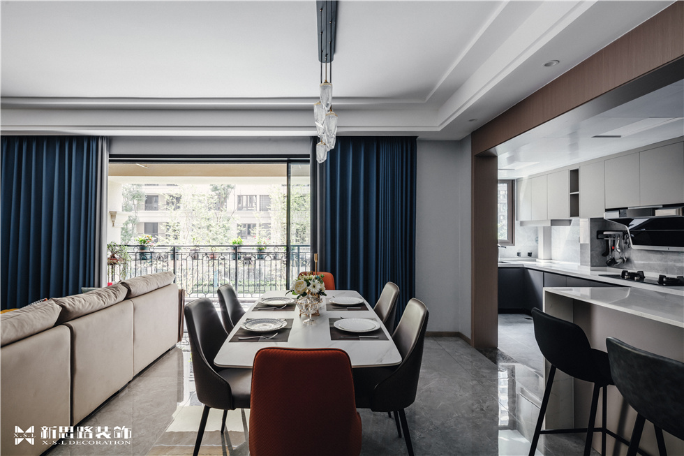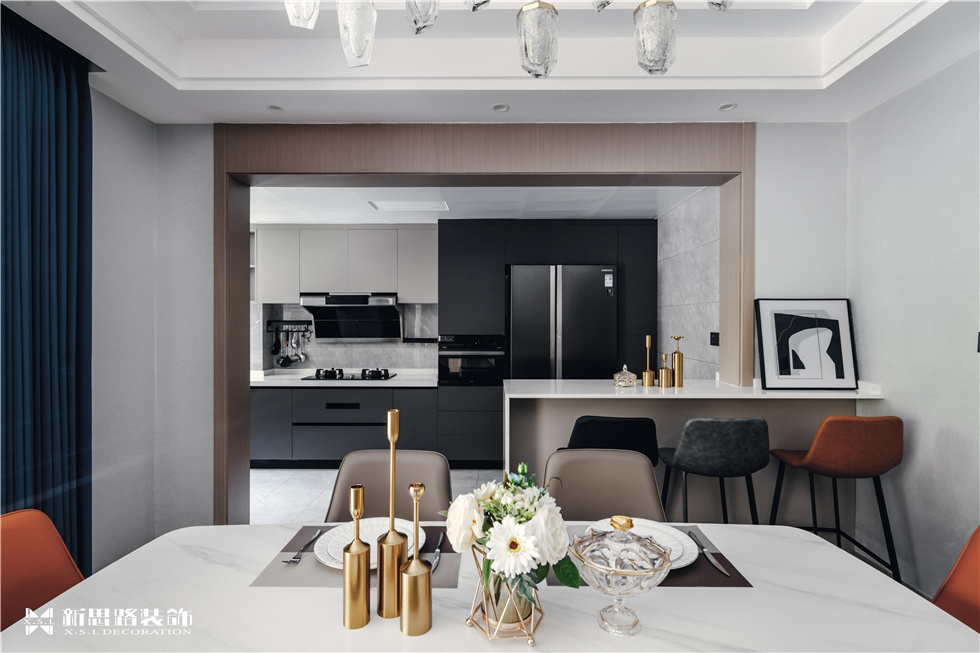 餐桌選用六人桌的款式,方中有圓,減輕空間中的棱角感。橙、灰、白拼色的搭配,現(xiàn)代感十足。吊燈造型如花苞又如水晶礦石,簡(jiǎn)約又有優(yōu)雅感。獨(dú)立的休閑吧臺(tái)能起到劃分開(kāi)放式廚房與客廳空間的作用,其不僅是吧臺(tái),也能作為西餐、冷餐料理臺(tái)使用,功能性強(qiáng)。閑來(lái)在此品咖啡,小坐娛樂(lè),不失舒適和放松,頗有情調(diào)