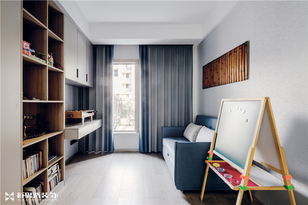 靠近客廳的房間改造成為獨(dú)立多功能房,打開(kāi)門(mén)后即可和客廳連為一體,起到間接為客廳分擔(dān)部分功能的作用。既能作為休閑娛樂(lè)、客人下榻的場(chǎng)所,也能作為書(shū)房使用,滿足了客戶想擁有一個(gè)安靜閱讀、工作和學(xué)習(xí)環(huán)境的需求。超大的書(shū)柜作為書(shū)籍、玩具、擺件的收納之處非常不錯(cuò),書(shū)桌臨近窗戶,優(yōu)秀采光更加護(hù)眼。
