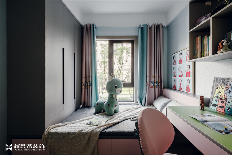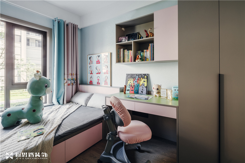 兒童房色調(diào)以小女孩喜歡的藍(lán)、粉為主,配以各種卡通裝飾,童趣活潑。床鋪?zhàn)龀闪碎介矫椎男问?,滿足孩子成長(zhǎng)時(shí)不斷增加的收納需求。獨(dú)立的懸掛書(shū)柜,不僅能放下孩子喜歡的圖書(shū),小女孩珍藏的小恐龍等擺件和玩偶也有了自己的“住處”。