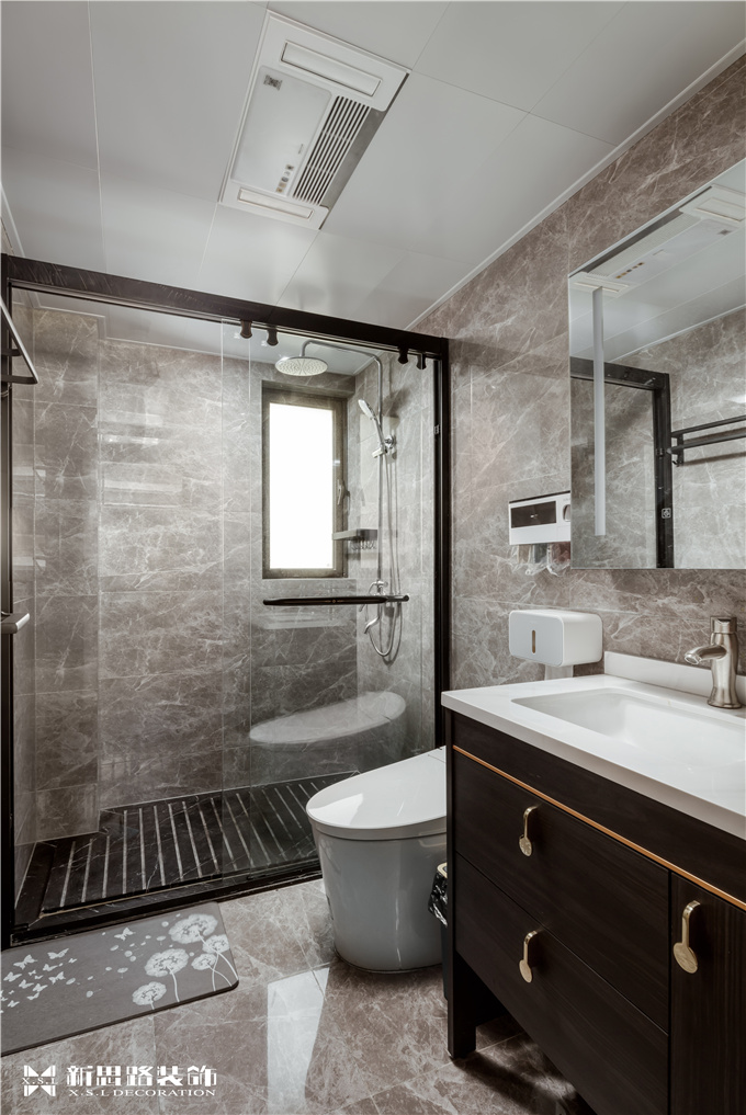 衛(wèi)生間整體使用深卡其色的大理石紋理瓷磚,低調(diào)奢華。干濕分離的設(shè)計(jì)很好地隔絕了沐浴會(huì)帶來(lái)的水汽對(duì)柜體的影響,減輕衛(wèi)生間積水和潮濕情況。淋浴間的防滑設(shè)計(jì)和馬桶旁的扶手都是為老人貼心準(zhǔn)備的,方便老人洗漱,更加安全,不易滑倒。