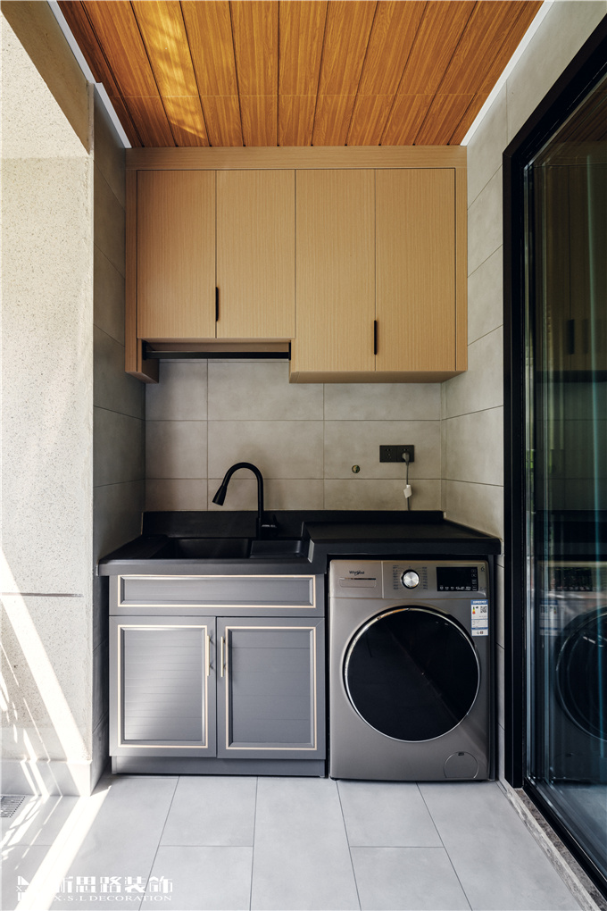 陽(yáng)臺(tái)功能為休閑、洗衣和晾曬區(qū)。大面積向陽(yáng)晾曬區(qū)滿足一家五口的需求,獨(dú)立于衛(wèi)生間的洗衣區(qū)配備洗衣槽,更符合老人的生活習(xí)慣。上方衣架收納桿實(shí)用又方便,即取即用。