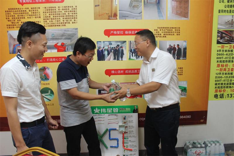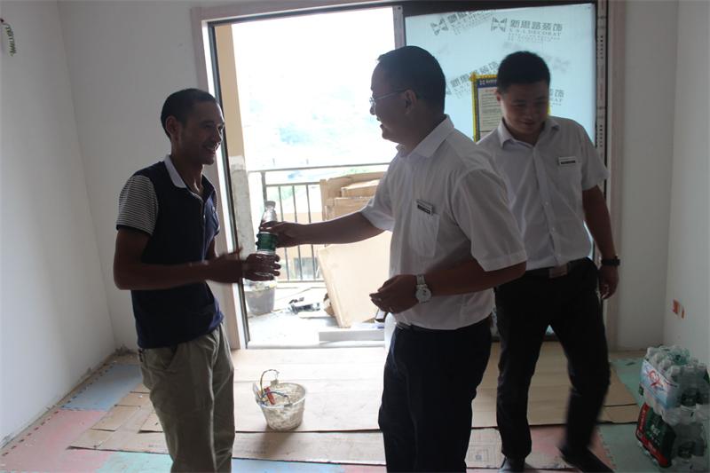 時下已是8月下旬,但山城氣溫依舊高居不下。炎炎夏日,驕陽似火,正是公司各施工工地趕工期、保品質的黃金時期。為了做好夏季防暑降溫工作,確保廣大一線員工的身心健康和安全,8月26日,新思路裝飾“2015夏季送清涼”活動正式啟動,以工程部、南坪店、北紅星店等部門組成的慰問小組,帶著藿香正氣水、礦泉水等防暑降溫物品,深入到工地施工一線,親切慰問在高溫下奮戰(zhàn)的工人師傅們,給他們送去了公司的關懷和絲絲清涼。