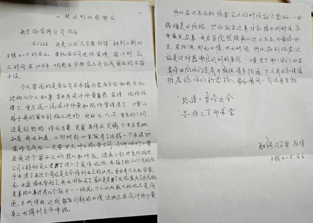 2019年1月18日,新思路裝飾收到了2019年的第一面錦旗與感謝信,來自江北融創(chuàng)凡爾賽·領館二期8棟的業(yè)主張老師專程來到南坪總部將一面印有“設計新穎,施工精良”的錦旗交給我們楊店長手中(張老師說這次來送錦旗也沒提前跟設計師和項目經理說,知道他們也忙,就自己過來了。張老師實在是太貼心了),以感謝新思路裝飾高品質工藝和優(yōu)質貼心的服務。