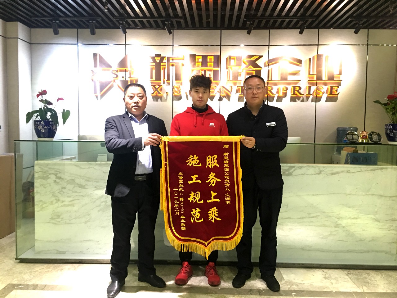2019年2月27日上午,來自慶隆高爾夫的歐老師專程來到南坪總部,將一面印有“服務(wù)上乘,施工規(guī)范”的錦旗交給我們的項目經(jīng)理文經(jīng)理手中,以感謝新思路裝飾高品質(zhì)工藝和優(yōu)質(zhì)貼心的家裝服務(wù)。