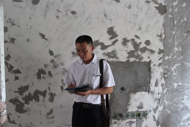 文經(jīng)理正在認真檢查墻磚鋪貼情況