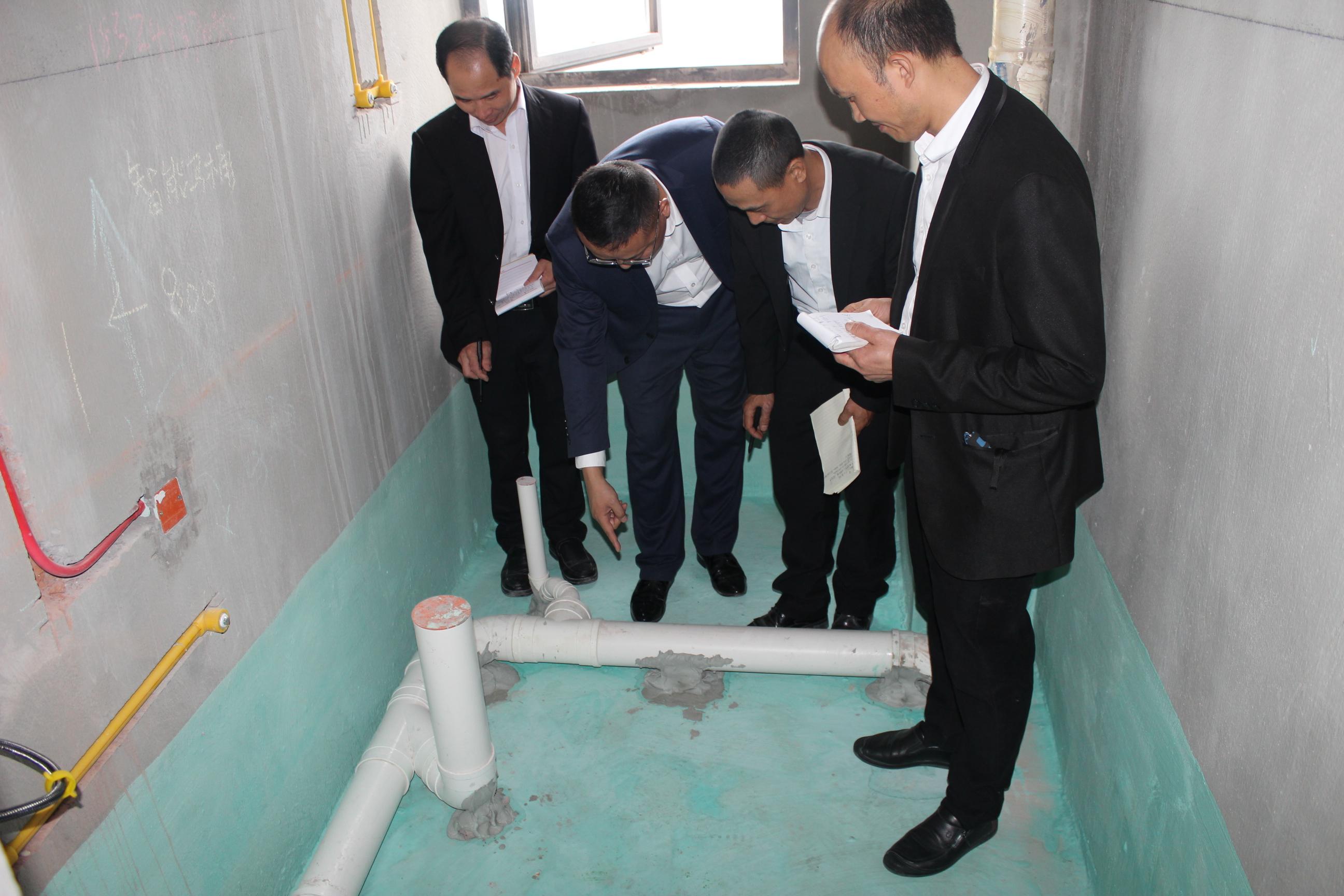 文經(jīng)理正在與各項(xiàng)目經(jīng)理討論防水工藝