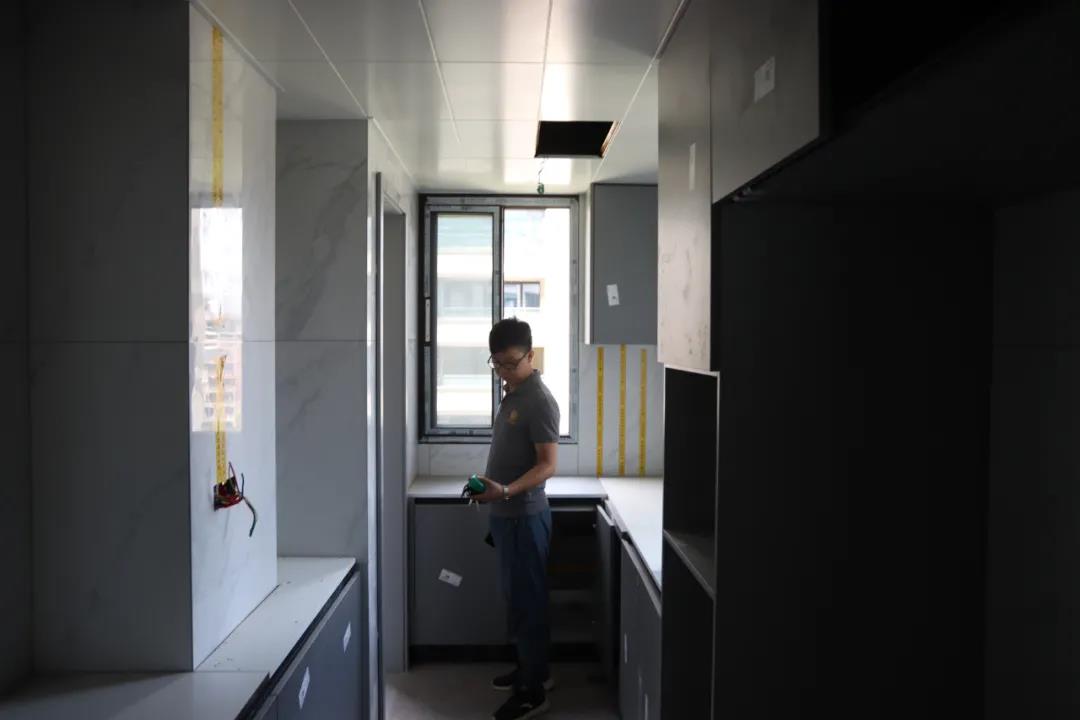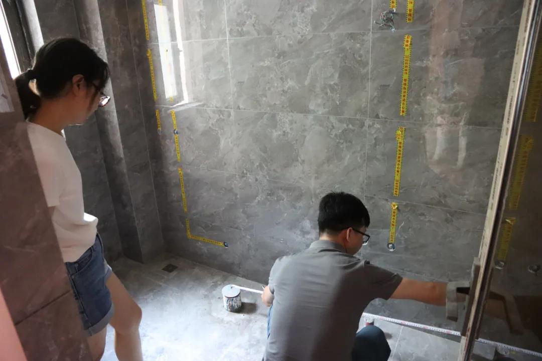 衛(wèi)生間瓷磚拼貼完成后,接下來就要準(zhǔn)備上馬桶、臺盆、柜子等的安裝。衛(wèi)生間空間有限,各個物品的尺寸需要復(fù)核多遍,保證最后在安裝的時候能夠正好符合。為此,設(shè)計師敖元壩和業(yè)主再次對衛(wèi)生間的一些尺寸進(jìn)行了測量。