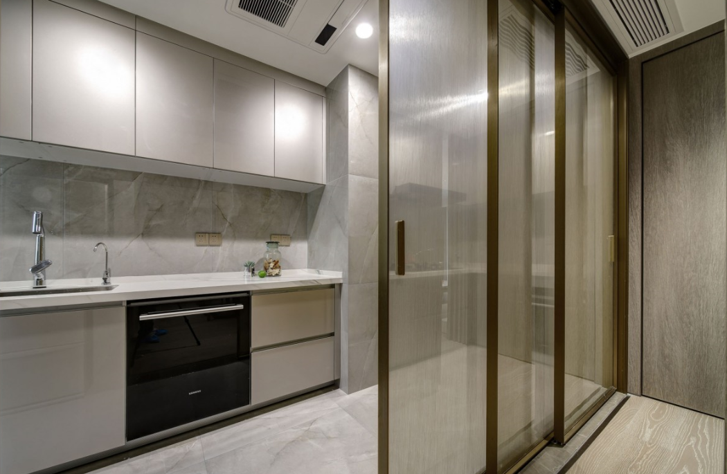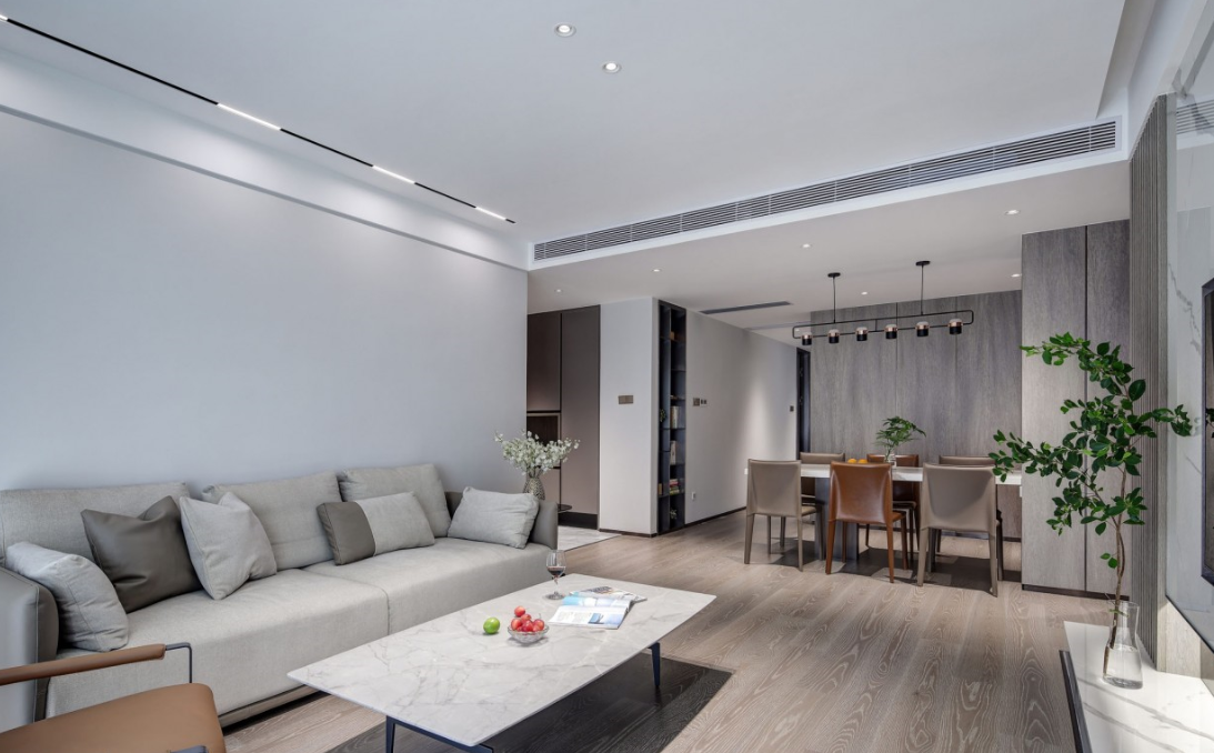 采用明亮而不眩目的無(wú)主燈設(shè)計(jì),筒燈與磁吸燈簡(jiǎn)約靈活的泛光照明,電視背景墻下隱藏?zé)魩У男Ч麪I(yíng)造,優(yōu)化了空間形體以及局部的明暗關(guān)系