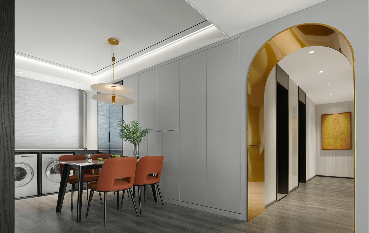 餐廳與客廳之間毫無阻隔,可以想象與好友們相聚用餐時的開放與隨性,不拘泥于空間的功能性。金色的包邊線條與白色皮革組合,產(chǎn)生一種當(dāng)下潮流的時尚之美,同時透過色彩搭配,來增強(qiáng)空間的整體性。