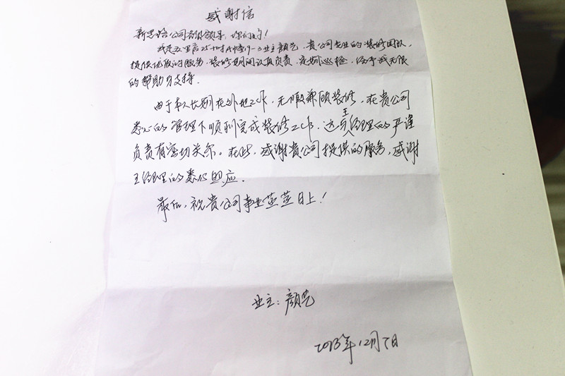 顏老師在信中表示:“由于本人長期在外地工作,無暇兼顧裝修,在貴公司的悉心管理下順利完成裝修工作。貴公司專業(yè)的裝修團隊,提供優(yōu)質的服務,裝修期間王經(jīng)理認真負責,質檢定期巡查工地,保證了工程質量。在此,感謝貴公司提供的裝修服務,感謝王經(jīng)理的細心照應。”