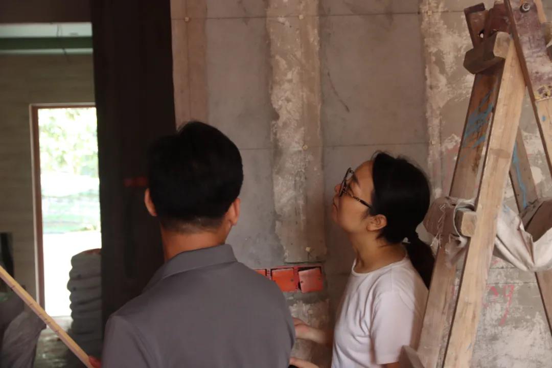 我們來到的第一處工地是水電階段剛結(jié)束、正在進(jìn)行硬裝階段的工地??蛻粽诠さ厣喜榭辞闆r,設(shè)計師敖元壩剛到現(xiàn)場,就和我們在施工的工人以及在場的客戶交流起來。